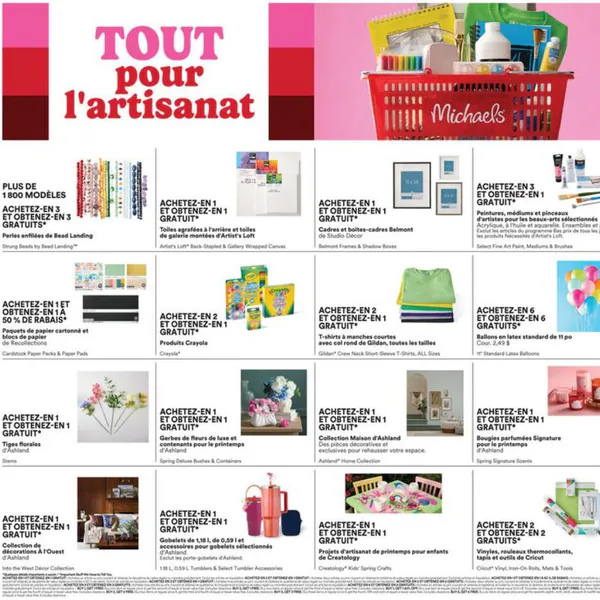 La circulaire Michaels du vendredi 10 avril au jeudi 16 avril 2026 présente une variété d’articles pour l’artisanat, incluant des perles, des toiles, des produits Crayola et des décorations florales.