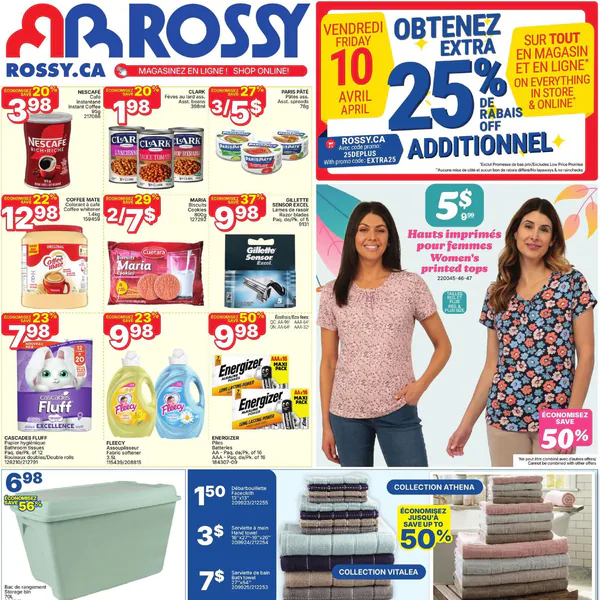 La circulaire Rossy présente des offres valables du 9 au 15 avril 2026, incluant des produits comme des pâtes à tartiner, des tops pour femmes, et des articles ménagers.
