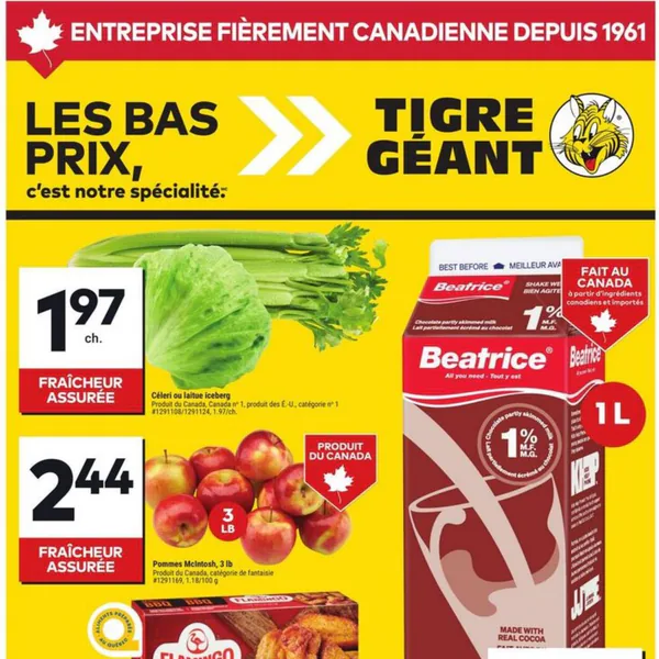 La circulaire Tigre Géant présente des offres valables du mercredi 8 avril au mardi 14 avril 2026, incluant des produits tels que des ailes de poulet BBQ Flamingo, des pommes McIntosh, du lait au chocolat Beatrice, des pâtes Primo et du café moulu Maxwell House.