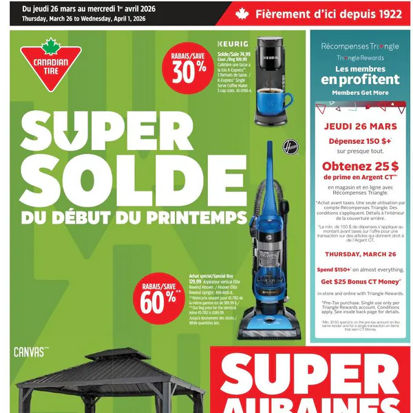 La circulaire Canadian Tire présente des soldes du début du printemps, valables du 26 mars au 1er avril 2026, avec des offres sur un aspirateur, un barbecue, et des pneus.