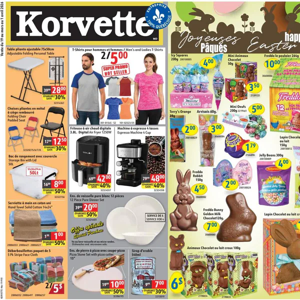 La circulaire Korvette présente des promotions allant du 19 mars au 1er avril 2026, incluant des T-shirts, une machine à espresso et divers chocolats pour Pâques.