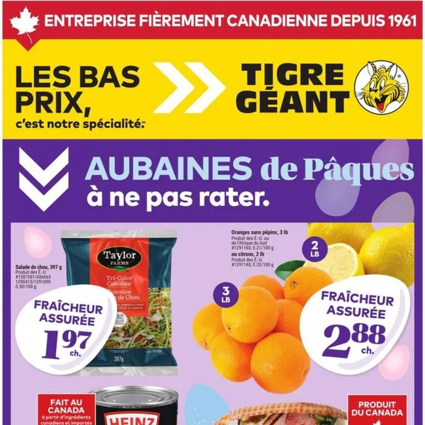 La circulaire Tigre Géant présente des aubaines de Pâques à ne pas rater, valables du 1er au 7 avril 2026, avec des produits comme des oranges, de la salade de chou, du jus de tomate et du jambon fumé.