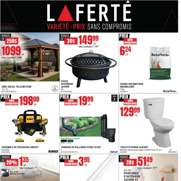 La circulaire Laferté valide du 2 au 8 avril 2026 présente des offres variées, incluant un abri-soleil Yellowstone à 1099,99 $, un foyer extérieur Jasper à 149,99 $, et un ensemble de perceuses impact à 198,00 $.