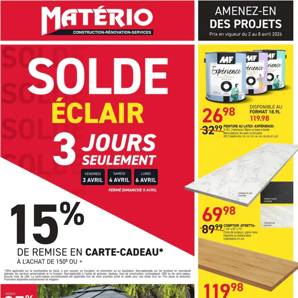 La circulaire Matério présente des soldes éclair du 2 au 8 avril 2026, avec des offres sur des produits comme la peinture au latex, le comptoir en bambou et un ensemble de cuisine.