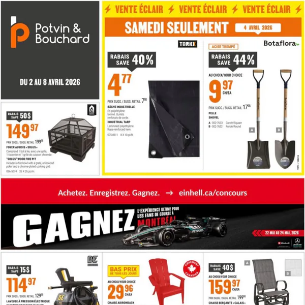 La circulaire Potvin & Bouchard valide du 2 au 8 avril 2026 présente une sélection d’articles incluant des bâches industrielles, des pelles, et des chaises Adirondack.