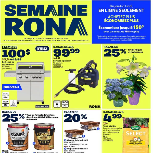 La circulaire Rona présente des rabais intéressants du 2 au 8 avril 2026, incluant un barbecue au gaz propane, une laveuse à pression, et des lys de Pâques.