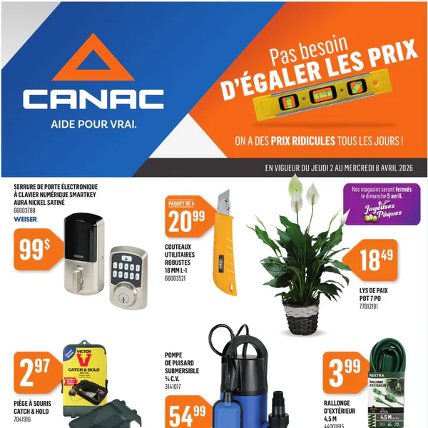 La circulaire Canac en vigueur du jeudi 2 avril au mercredi 8 avril 2026 présente des produits variés tels qu’une serrure de porte électronique à clavier, des couteaux utilitaires, un lys de paix, une pompe de puisard submersible et une rallonge d’extérieur.