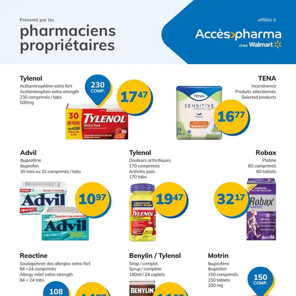 La circulaire Accès Pharma présente des produits de santé variés, disponibles du 9 au 29 avril 2026, incluant des médicaments comme Tylenol extra fort, Advil, et des solutions pour l’incontinence comme TENA.