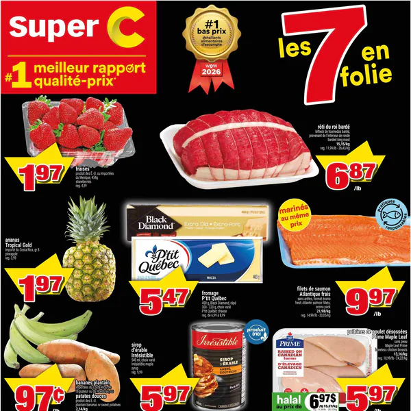 La circulaire Super C valide du 16 au 22 avril 2026 présente des offres intéressantes, incluant des fraises, du rôti de boeuf, du fromage, des filets de saumon et des ailes de poulet.