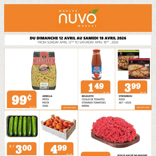 La circulaire Marché Nuvo présente des offres valables du 12 au 18 avril 2026, incluant des pâtes Arbella, du coulis de tomates Belgusto, des pizzas Stromboli, du boeuf haché mi-maigre et du fromage Brie double crème Baron.