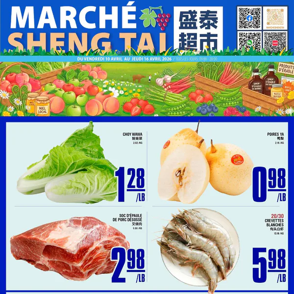 La circulaire Marché Sheng Tai présente des offres valables du vendredi 10 avril au jeudi 16 avril 2026, incluant des produits frais tels que le choy wawa, des poires, de la soc d’épaule de porc désossée, des crevettes blanches et des dattes rouges BT.