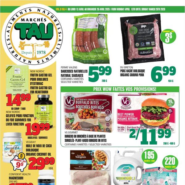 La circulaire Marchés TAU présente des offres variées du 13 au 26 avril 2026, incluant des saucisses naturelles, du porc haché biologique et de l’huile de noix de coco.