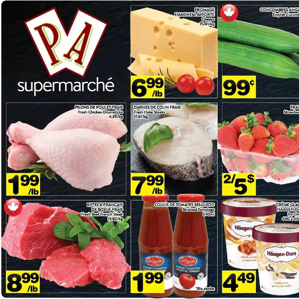 La circulaire Supermarché PA valide du lundi 13 avril au dimanche 19 avril 2026 présente des offres sur des produits frais, incluant des pilons de poulet à 1,99 $/lb, des fraises à 2 $ pour 5 lb, et des concombres anglais à 0,99 $ chacun.