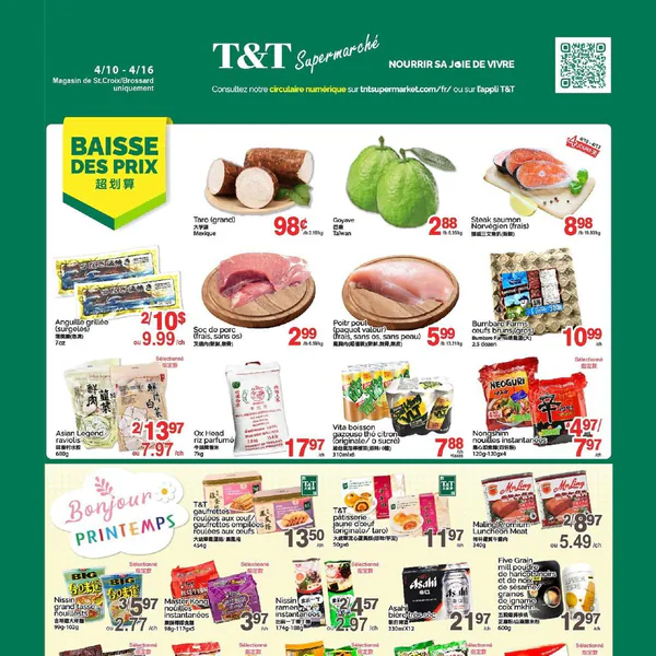La circulaire Supermarché T&T présente des offres valables du vendredi 10 avril au jeudi 16 avril 2026, incluant des produits comme le taro, le steak de saumon norvégien, et des nouilles instantanées.