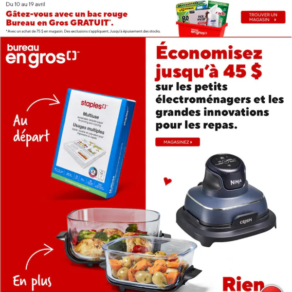 La circulaire Bureau en Gros valide du 10 au 16 avril 2026 présente des offres sur divers articles, incluant une friteuse à air portable Ninja et des essuie-tout Bounty.