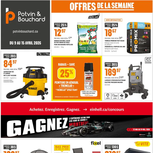La circulaire Potvin & Bouchard, valable du 9 au 15 avril 2026, propose des offres intéressantes, incluant un aspirateur à sec et humide Dewalt à 84,97 $, un barbecue Dyna-Glo à 199,97 $, ainsi qu’une peinture en aérosol Tremclad à 12,97 $.