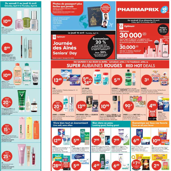 La circulaire Pharmaprix présente des promotions valables du 11 au 16 avril 2026, incluant des produits comme des soins pour la peau, des articles d’hygiène et des produits de beauté.