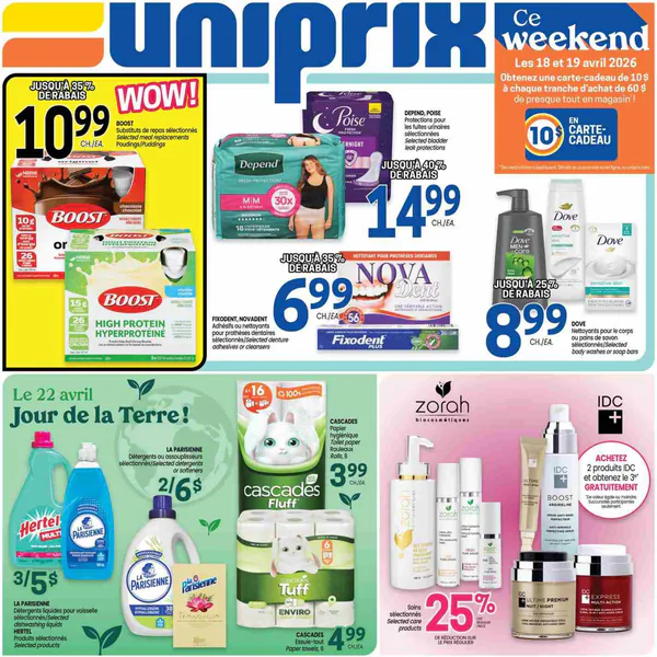 La circulaire Uniprix présente des promotions valables du 16 au 22 avril 2026, incluant des produits tels que des boissons Boost, des protections Depend, et des soins Dove.
