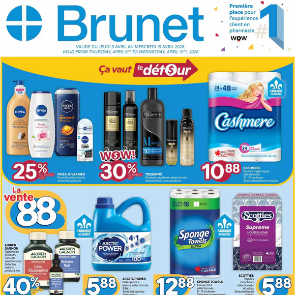 La circulaire Brunet valide du 9 au 15 avril 2026 présente des promotions sur divers produits, incluant des articles de soins personnels comme des shampoings NIVEA et TRESemmé, ainsi que des produits ménagers comme le détergent Arctic Power et les essuie-tout Sponge Towels.
