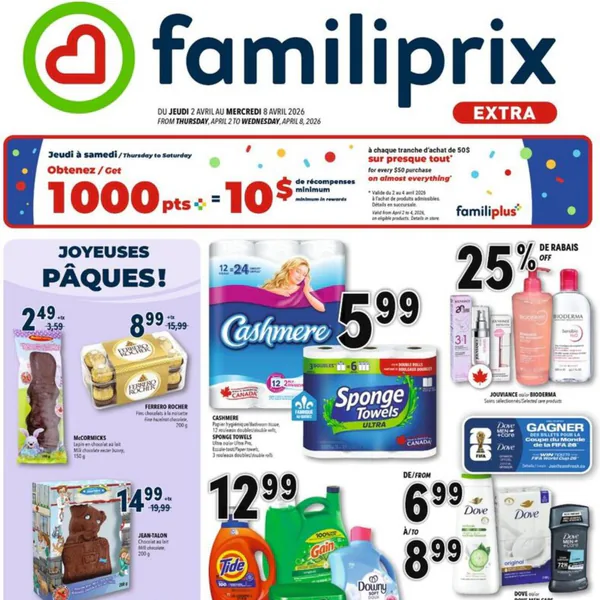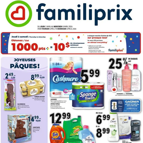 La circulaire Familiprix présente des offres intéressantes valables du jeudi 2 avril au mercredi 8 avril 2026, incluant des produits comme le papier de toilette Cashmere, les serviettes Sponge, et des chocolats pour Pâques.