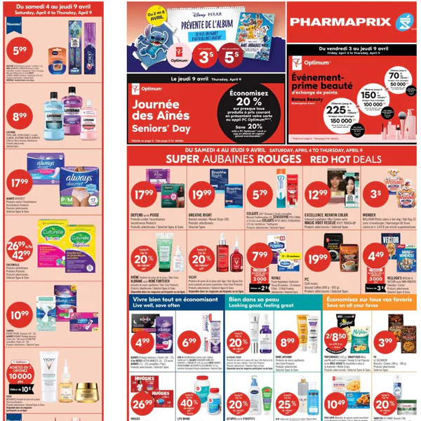 La circulaire Pharmaprix présente des offres valables du samedi 4 avril au jeudi 9 avril 2026, incluant des produits tels que des soins personnels, des médicaments et des articles de beauté.