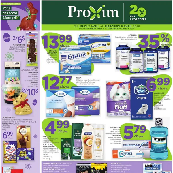 La circulaire Proxim du 2 au 8 avril 2026 présente des offres sur divers produits, incluant des chocolats sélectionnés, des produits de soin personnel et des articles ménagers.