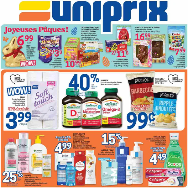 La circulaire Uniprix présente des promotions du jeudi 2 avril au mercredi 8 avril 2026, incluant des offres sur des chocolats de Pâques, des produits de soins personnels et des articles ménagers.