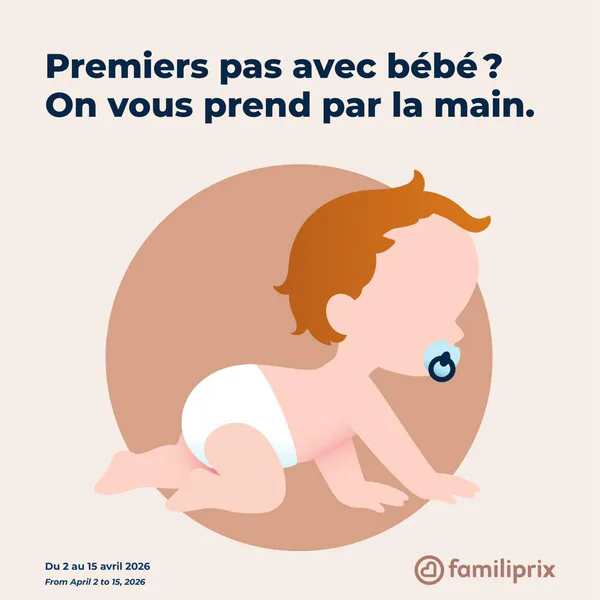 Le guide Familiprix du 2 au 15 avril 2026 vous accompagne dans les premiers pas avec bébé, en présentant des articles essentiels tels que des couches, des lingettes, des produits de soin et des jouets adaptés.