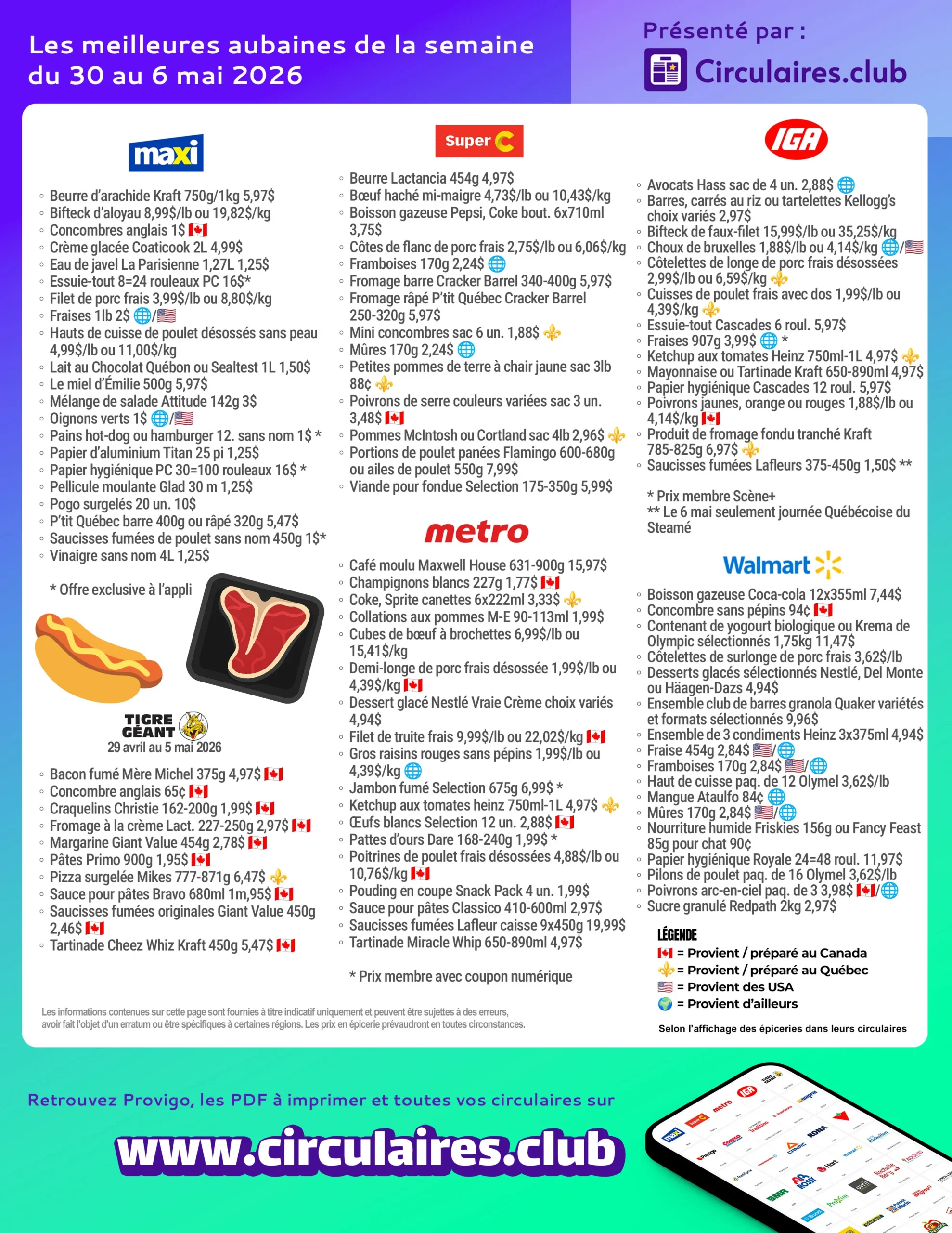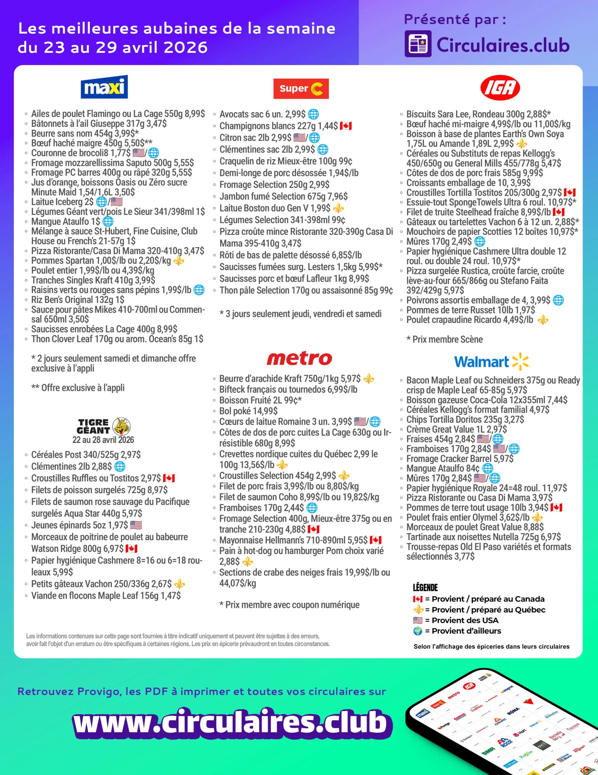 Trouvez les meilleurs rabais de la semaine en épicerie tous les mardis vers midi. Ajoutez à votre liste d’épicerie les meilleures aubaines des circulaires pour économiser.