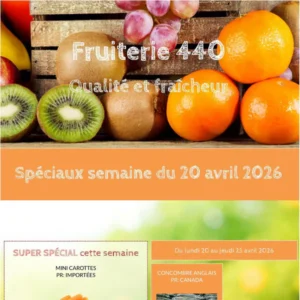 La circulaire de la fruiterie 440 à Laval est une référence de qualité et fraîcheur si vous êtes à la recherche de fruits et légumes à bon prix. consultez leur circulaire valide dans leurs succursales d’Anjou, Greenfield Park, Terrebonne et Québec.