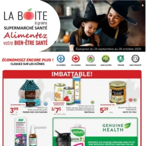 La circulaire de La Boîte à grains Supermarché Santé vous propose de feuilleter les aubaines et de faire le plein de suppléments et de produits santé pour une alimentation saine.