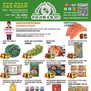 La circulaire Marché Newon est remplie des meilleures offres en vigueur sur les légumes, les fruits, les collations et les repas asiatiques. Passionné par les traditions d’Asie, le Marché Newton est une destination de choix pour les gens à la recherche d’une épicerie asiatique remplie de produits importés de Chine à Montréal. Il y a deux succursales, soit la première sur Jean-Talon Ouest et l’autre sur Ste-Catherine.