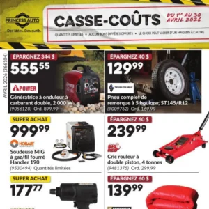 La Circulaire de Princess Auto propose une vaste sélection d’outils, d’équipement et de pièces pour tous les bricoleurs et les professionnels. Elle met en avant les meilleures offres et promotions du moment, permettant à ses clients de réaliser des économies tout en se procurant des produits de qualité. Grâce à la circulaire de Princess Auto, chacun peut trouver ce dont il a besoin pour mener à bien ses travaux!